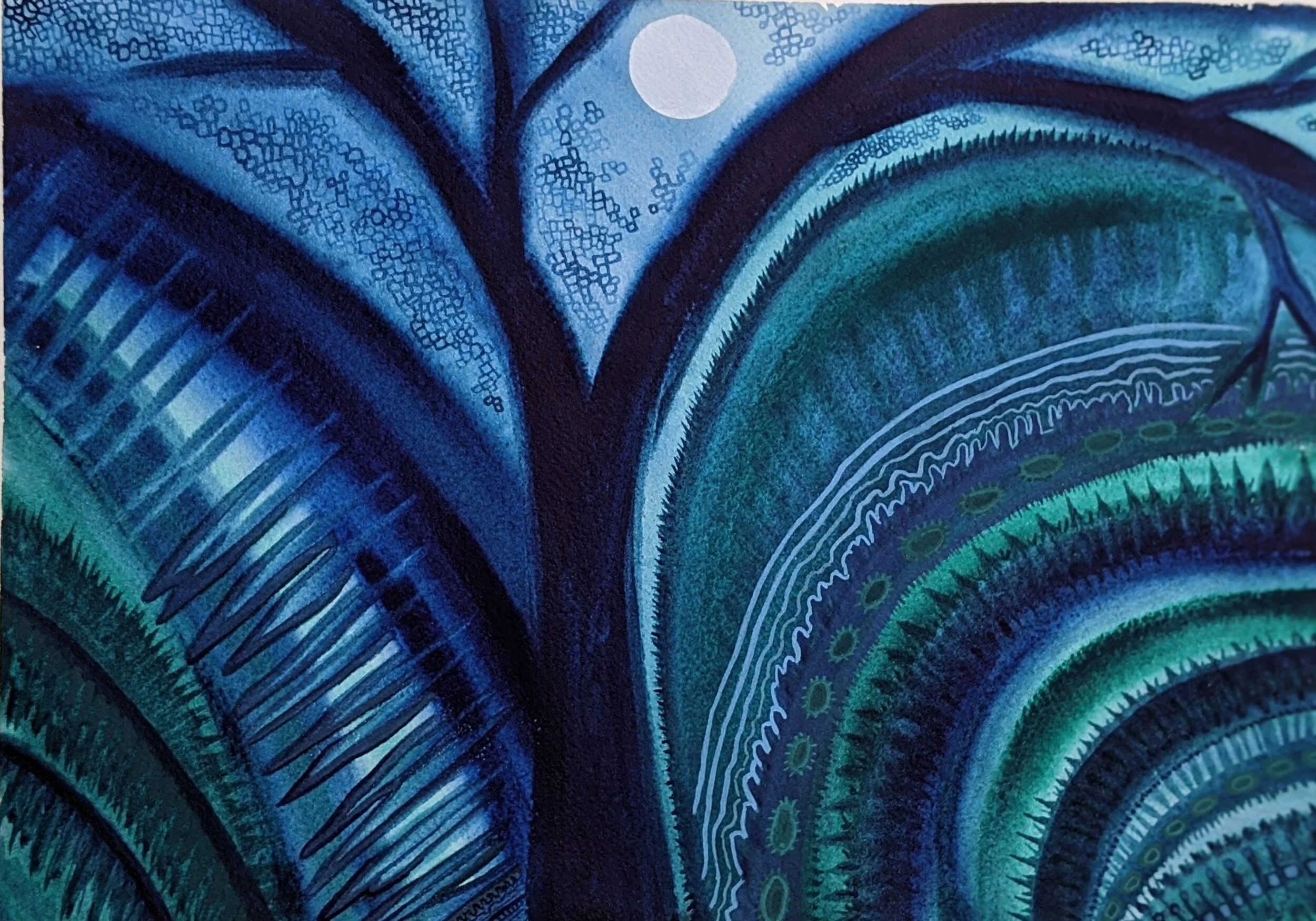 Moon Tree, 9.25 x 13.25 in, gouache on paper, 2019